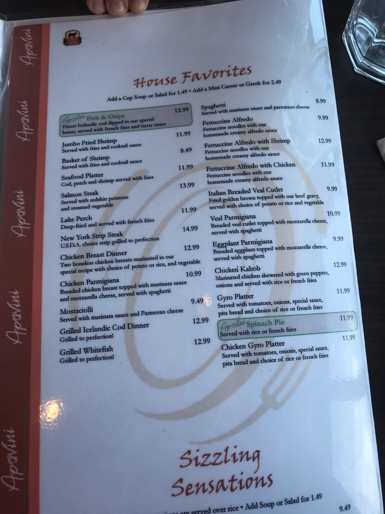 Introducing the menu at Apovini Grill! This Greek restaurant in Troy, MI offers a variety of options for starters, including the Apovini Sampler with wing dings, cheese sticks, chicken tenders, and potato skins. Specials like the Rise and Shine Breakfast and the Apovini Special are sure to satisfy. The hot off the grill section boasts a range of pancake options, from classic to creative like Nutella and M&M pancakes. Customer reviews rave about the grilled chicken Greek salad with the signature pink dressing, the addictive flavors, and the generous portions. The family-friendly atmosphere, fast service, and delicious marinades make Apovini Grill a hidden gem worth discovering. Don't miss out on the delectable dishes and warm hospitality at Apovini Grill!